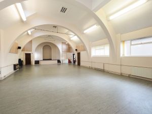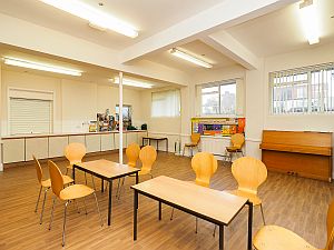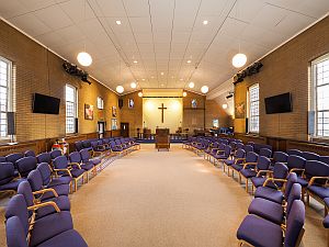 The hall (formerly the 1935 church) seats 120, or 80 at tables. It has a stage at one end, several store rooms and provision for stage lighting.