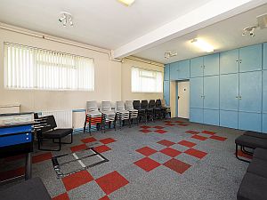 The room was upgraded in 2019 by covering most of the floor with carpet. The floor by the hatch has a vynyl covering so that any spillages can easily be mopped up. A small cupboard to the left of the hatch holds eight 4ft Gopak folding tables.